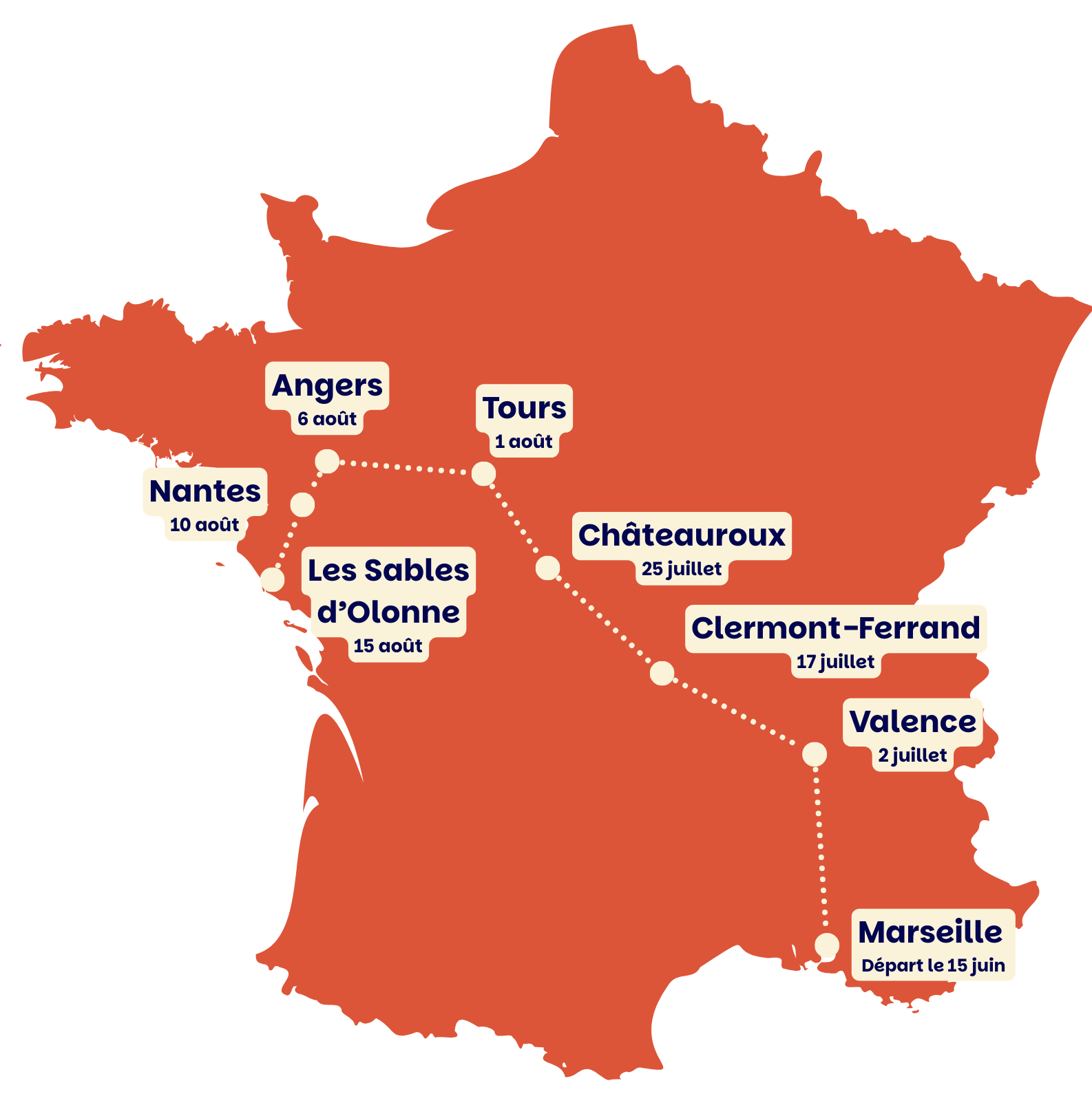 Nous relierons Marseille aux Sables d’Olonnes, en traversant une grande diversité de territoires : grandes métropoles, villes moyennes et zones rurales.